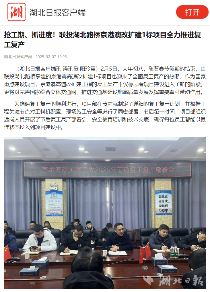 2月7日,湖北日報(bào)報(bào)道了聯(lián)投湖北路橋京港澳高速改擴(kuò)建1標(biāo)項(xiàng)目搶工期、抓進(jìn)度,全面推動(dòng)復(fù)工復(fù)產(chǎn)的施工景象,以下是報(bào)道全文: