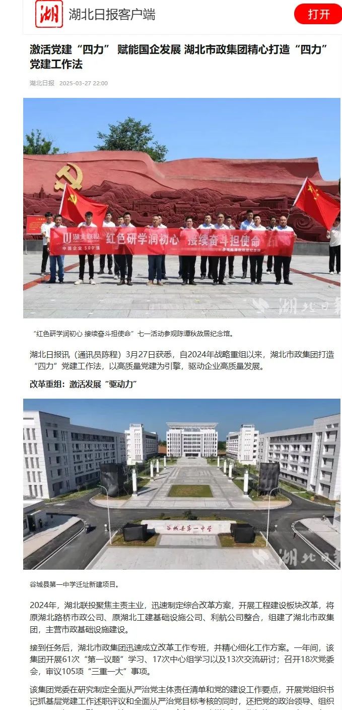 自2024年戰(zhàn)略重組以來,湖北市政集團(tuán)打造“四力”黨建工作法,以高質(zhì)量黨建為引擎,驅(qū)動(dòng)企業(yè)高質(zhì)量發(fā)展。